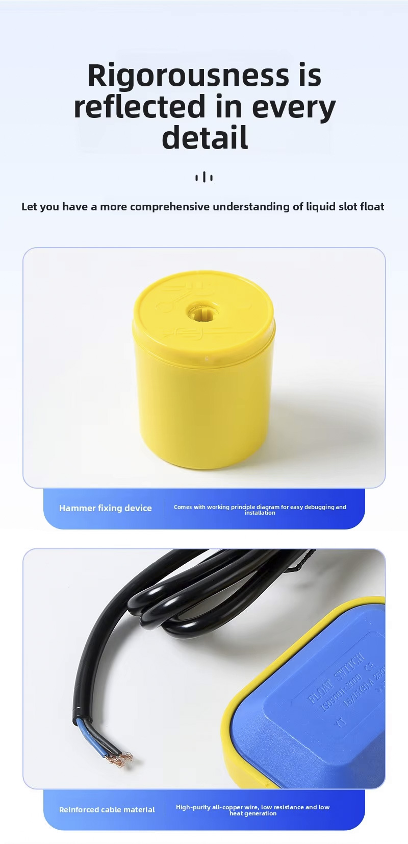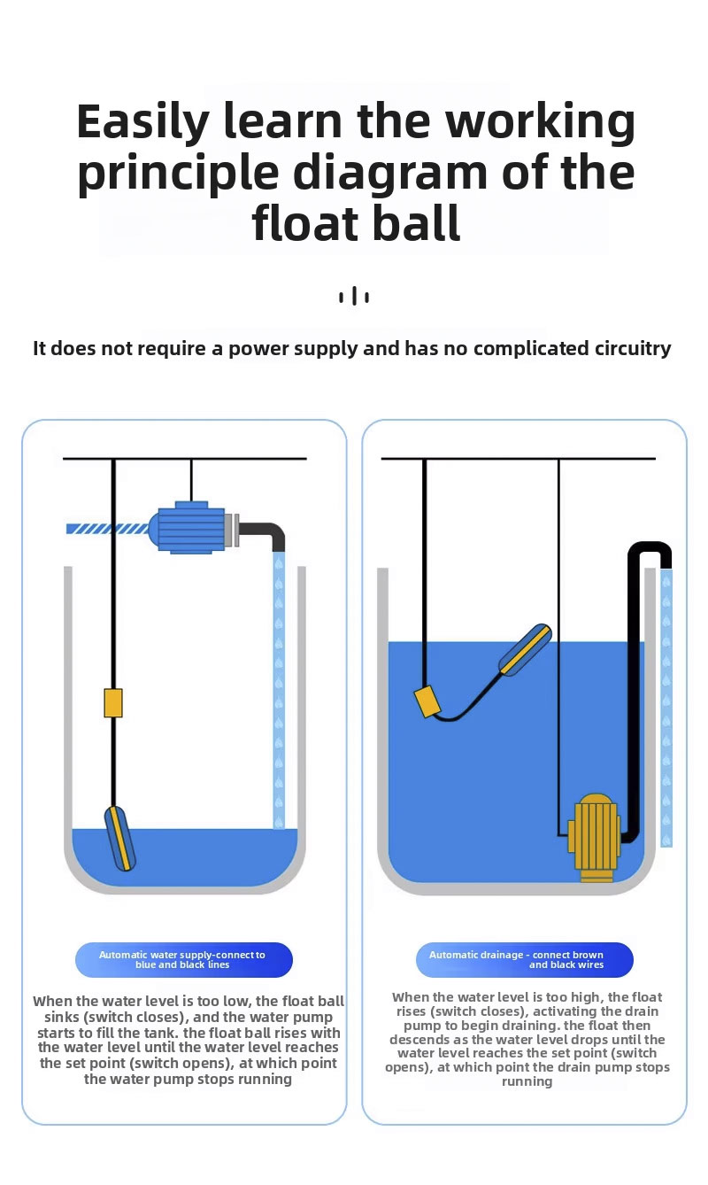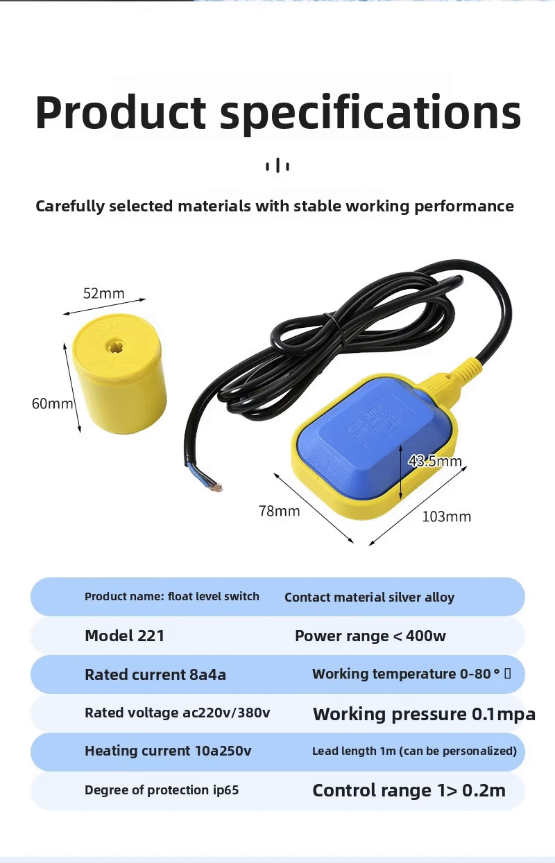 Ngalih ngambang iki nduweni desain bunder gedhe kanthi 2m, 3m, 5m, 10m, kelas proteksi IP68, lan beroperasi ing suhu saka 0 ℃ nganti 80 ℃, Ndhukung sawetara voltase saka 110V nganti 220V lan nduweni tekanan kerja sing kuat ± 0.5Mpa. layanan, njamin adaptasi kanggo macem-macem aplikasi.
