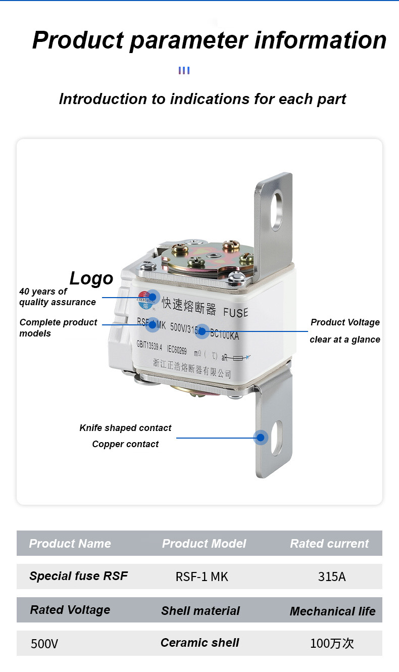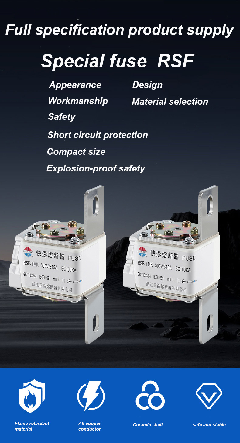 RSF-1MK 500V-315A BC100KA Fuse Links minangka pemutus sirkuit industri kinerja dhuwur sing cocog kanggo skenario proteksi listrik kanthi daya dhuwur. Link sekring RSF-1K 500V-315A BC100KA
