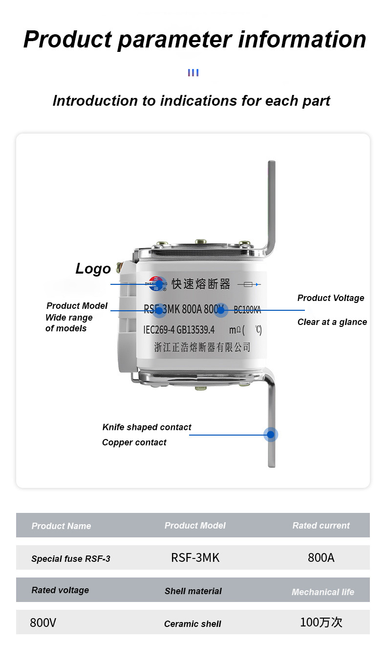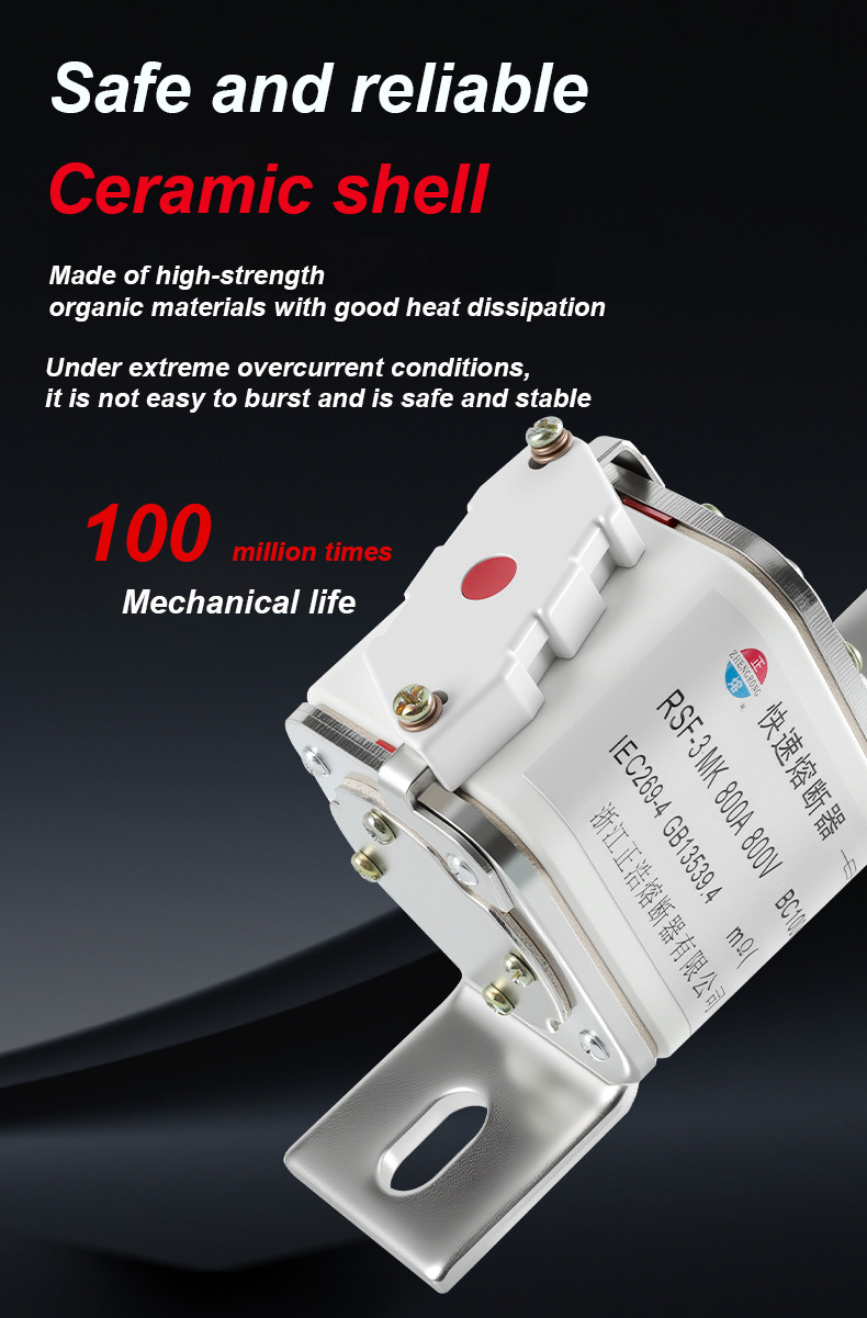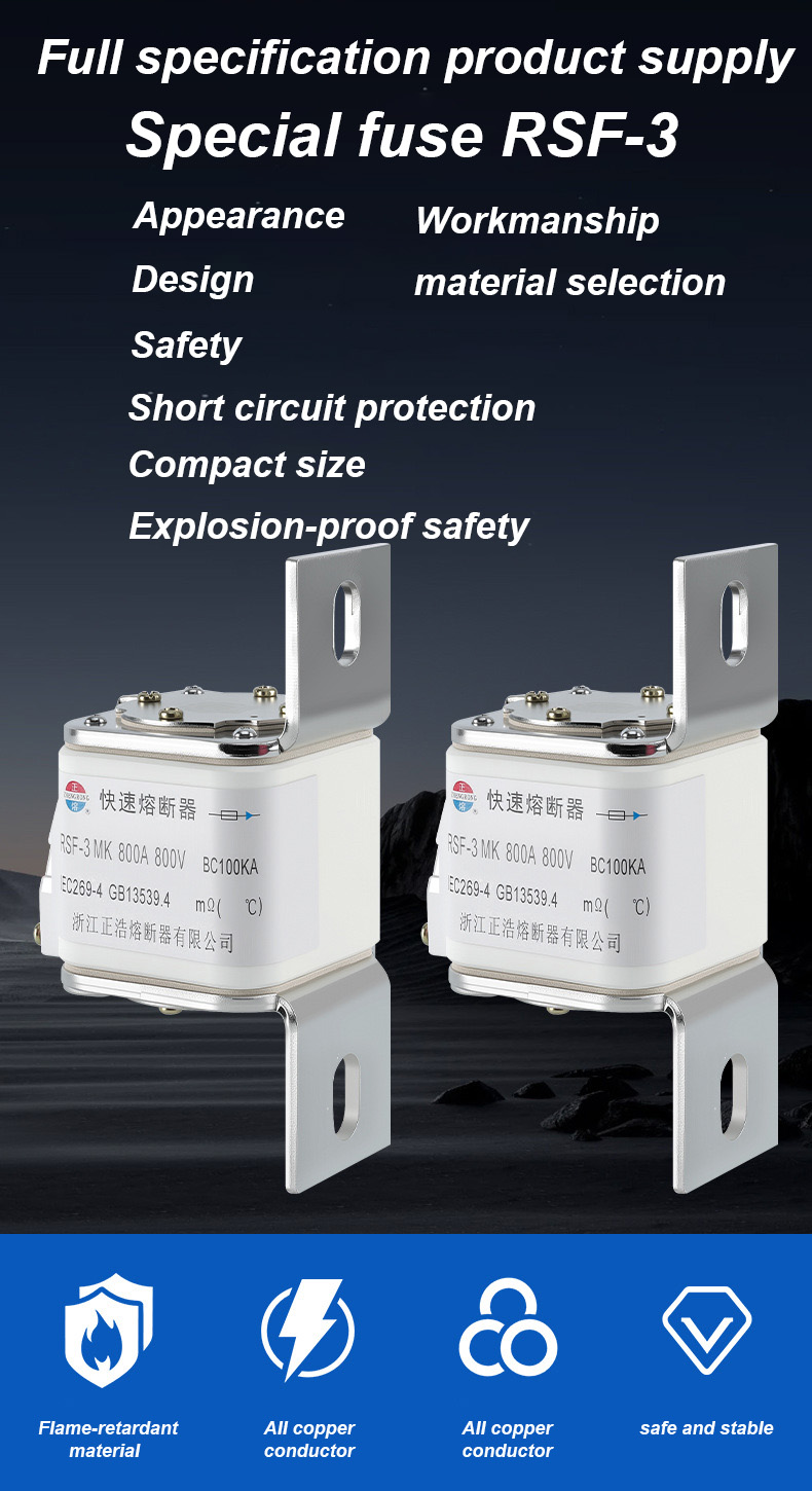RSF-3MK 800V-800A BC100KA Fuse Links minangka pemutus sirkuit industri kinerja dhuwur sing cocog kanggo skenario proteksi listrik kanthi daya dhuwur. Link sekring RSF-3MK 800V-800A BC100KA