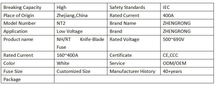 ZHENGRONG NT2 315A 500V Sekring keramik kothak biasane digunakake ing peralatan listrik industri, sistem daya lan peralatan elektronik kanggo nglindhungi sirkuit saka kakehan lan sirkuit cendhak.